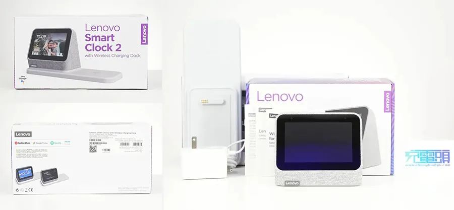 包装盒正面印有Lenovo品牌、产品英文名称以及外观图;底部印有产品款式外观图、支持功能以及型号等信息;包装内含时钟、底座、适配器、说明书等。