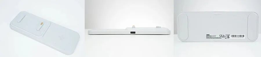 底座为扁平直板造型,四端以及边缘过渡圆润,表面哑光并有很多五颜六色小圆点,使得底座整体看上去像花岗岩一般,右侧凸起。无线充电区域设有十字胶垫,支持稳定手机同时更好散热。侧面设有一个USB-A接口,黑色胶芯。底部两侧设有防滑胶垫,边缘贴有产品铭牌贴纸。底座型号为SE-A61UW,支持12V1.5A输入,USB-A输出5V2A,无线充输出最大10W,总输出7.5W(无线充5W,USB-A口5V0.5A),产品通过了CE认证。