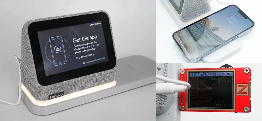 连接适配器并打开开关,首先会出现一个让用户手机下载Google Home app的提示界面,即产品支持手机app智能控制,设置简单方便。底座上的氛围灯亮白光。同时可以将手机放在底座右侧进行无线充电,晚上入睡前为手机充电变得更加方便。使用ChargerLAB POWER-Z KT002测得USB-A口只支持Samsung 5V2A、DCP协议。