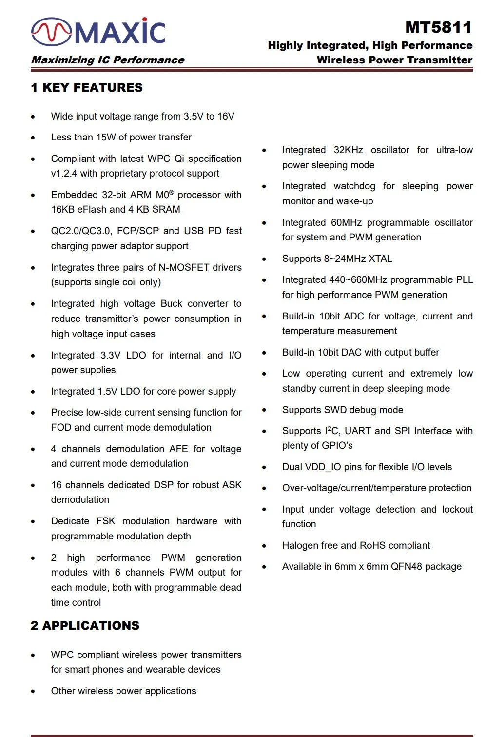 无线充电芯片来自亿万28网页在线玩-亿万28入口网页版-亿万28网页版网址-亿万28赌博-亿万28下载链接-亿万网站pg-亿万e网址pg-亿万28赏金女王,型号为MT5811,是一款集成USB PD、QC等快充协议、高度集成的符合Qi标准的无线充电发射芯片,支持15W输出功率。MT5811集成ARM M0 处理器,拥有卓越的高效率和紧凑设计,提供强大、自主的二次开发空间。芯片内部集成3对NMOS驱动器,可用于单线圈应用的无线充电器,支持定频调压控制,无需外置驱动器。