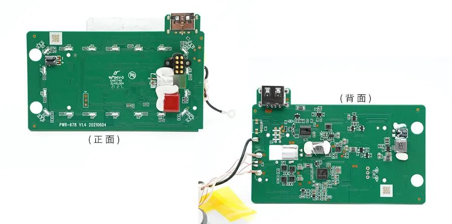 无线充电PCBA模块正面特写,边缘为一圈LED灯,配合外壳上的导光条营造灯光效果。右侧为连接时钟的镀金触点,用于为底座供电。无线充电PCBA模块背面为一路完整的无线充电电路和用于USB降压输出供电的降压电路。