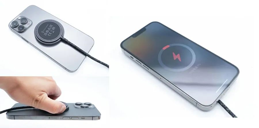 产品使用场景一览,和iPhone13 Pro Max相比,显得很小巧。另外产品可以轻松将苹果这款手机吸附起来,吸附力很好。通电后可以正常给手机进行无线充电。