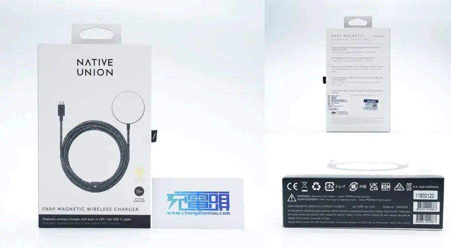 包装盒正面印有Native Union品牌、产品外观、名称以及卖点,支持磁吸无线充以及15W功率;背面印有产品特性描述,此外还贴有信息贴纸以及防伪标签;底部印有警示语、认证标识以及型号等信息。