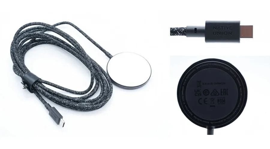 这款无线充自带USB-C线缆,并采用黑白线编织工艺打造,整体外观独特且更加耐用。机身为经典圆盘设计,黑白色外壳。线缆两端均做了抗弯折处理,USB-C线头外壳上设计有品牌logo。无线充机身两部分外壳贴合紧密,做工很好。底部有产品参数信息: