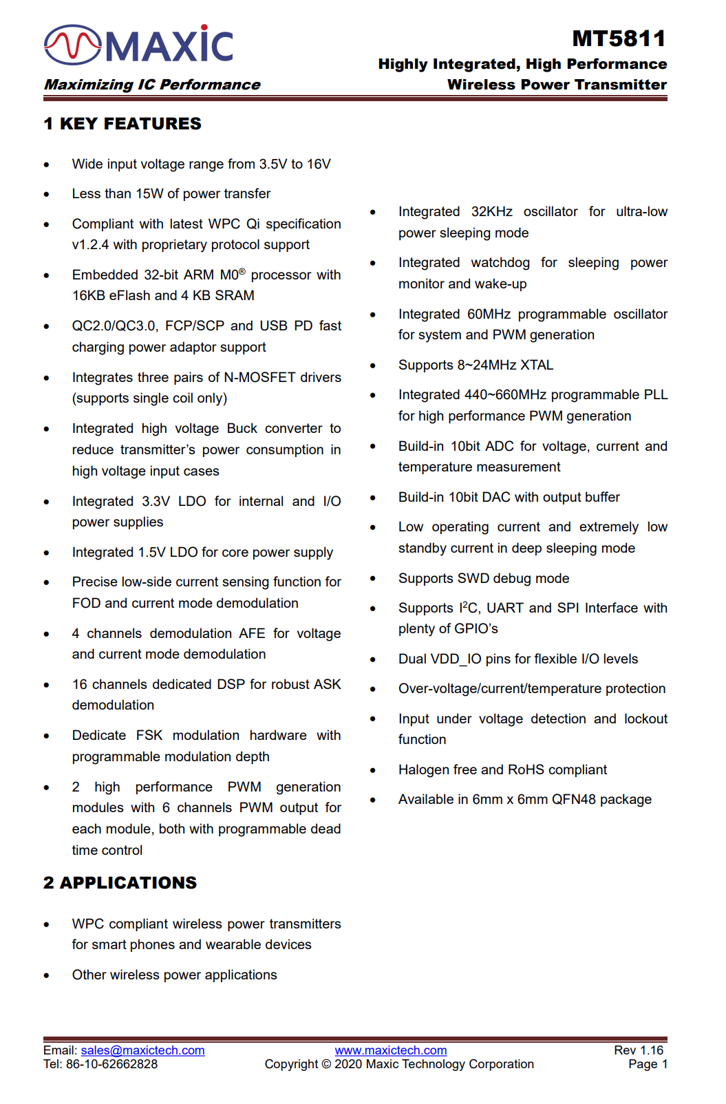 无线充电主控芯片采用亿万28网页在线玩-亿万28入口网页版-亿万28网页版网址-亿万28赌博-亿万28下载链接-亿万网站pg-亿万e网址pg-亿万28赏金女王MT5811,这是一颗高度集成的无线充电SoC,支持3.5-16V宽范围供电,支持小于15W的无线充电应用,芯片符合WPC Qi 1.2.4规范,并支持私有充电协议,芯片内部集成32位M0处理器,16KB eFlash和4KB SRAM。