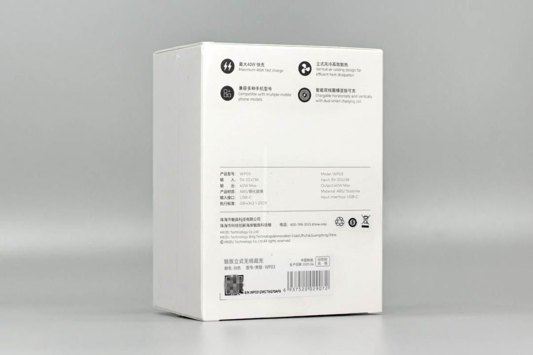 包装盒为白色,设计也比较简洁,正面印有MEIZU品牌、无线充外观和名称。