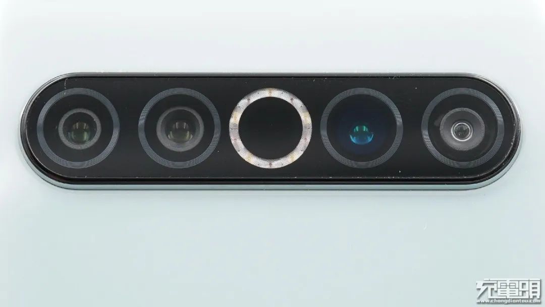 背面上端是6400W四摄全场景影像系统,从左往右依次是长焦相机,广角相机,3D深感探测器和超广角相机,中间白色圆环为内置闪光灯。