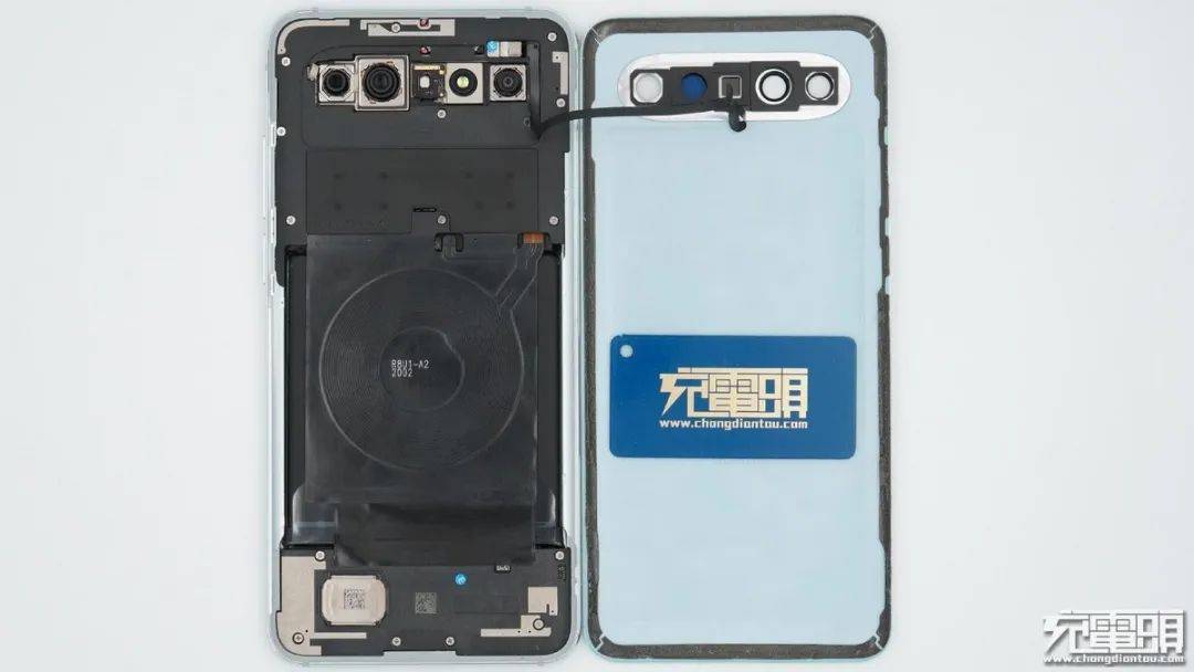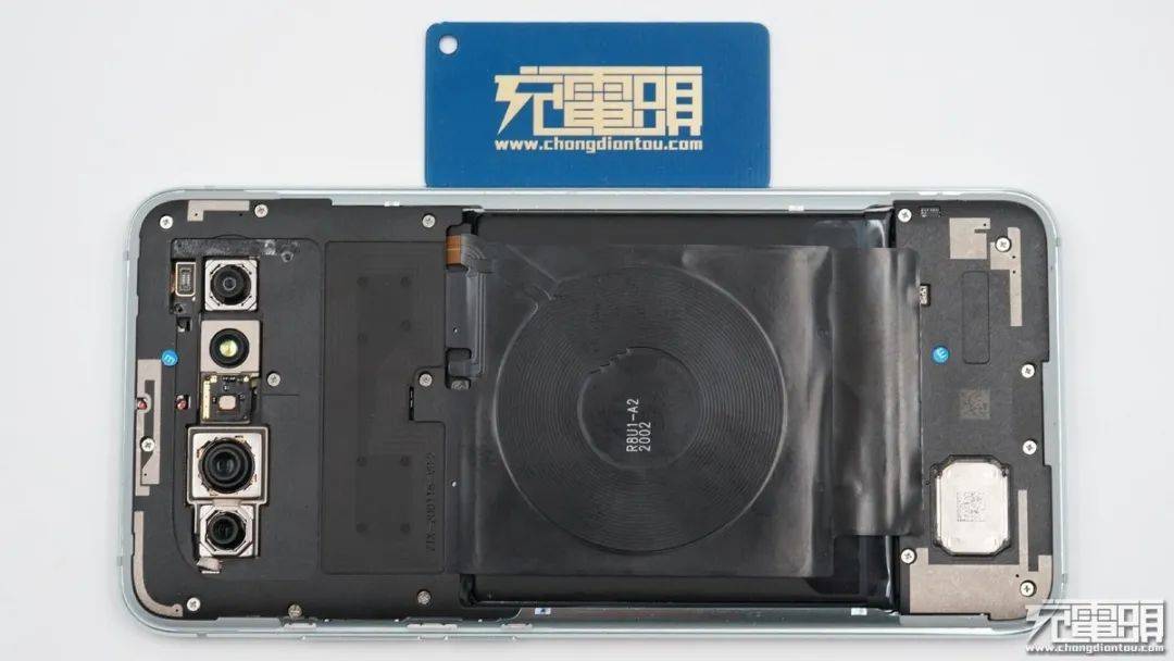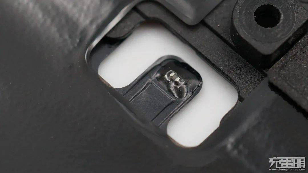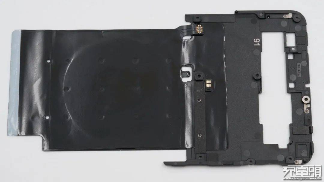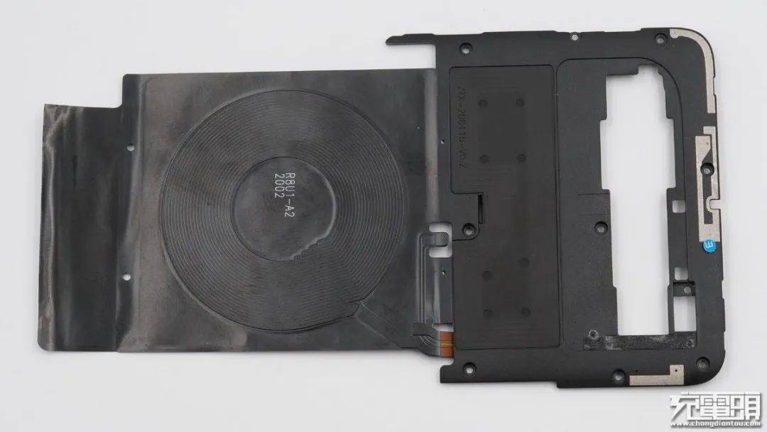 背面一览,无线充电线圈与主板通过连接器连接,方形触点为NFC线圈触点。