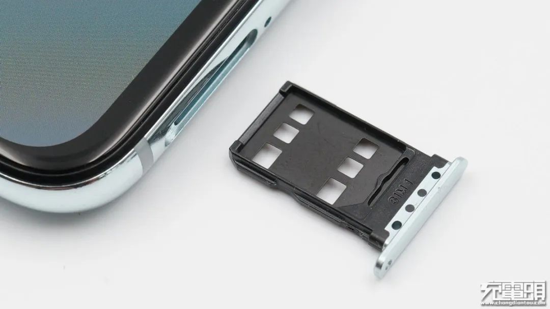 SIM卡座特写,卡槽采用正背面设计,支持双卡双待的同时节省空间。