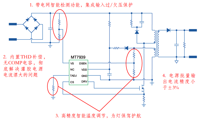 MT7939∣集成输入过压/欠压保护的高PF隔离 超低THD恒流解决方案