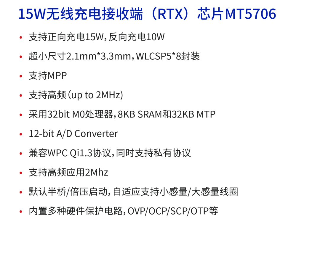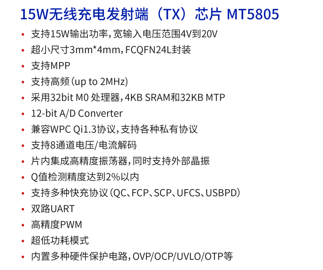 该方案可应用于手机、PAD、可穿戴设备、智能配件、电动牙刷、移动电源、车载支架等中小功率消费电子产品。MT5706+MT5805方案输出功率可达15W。