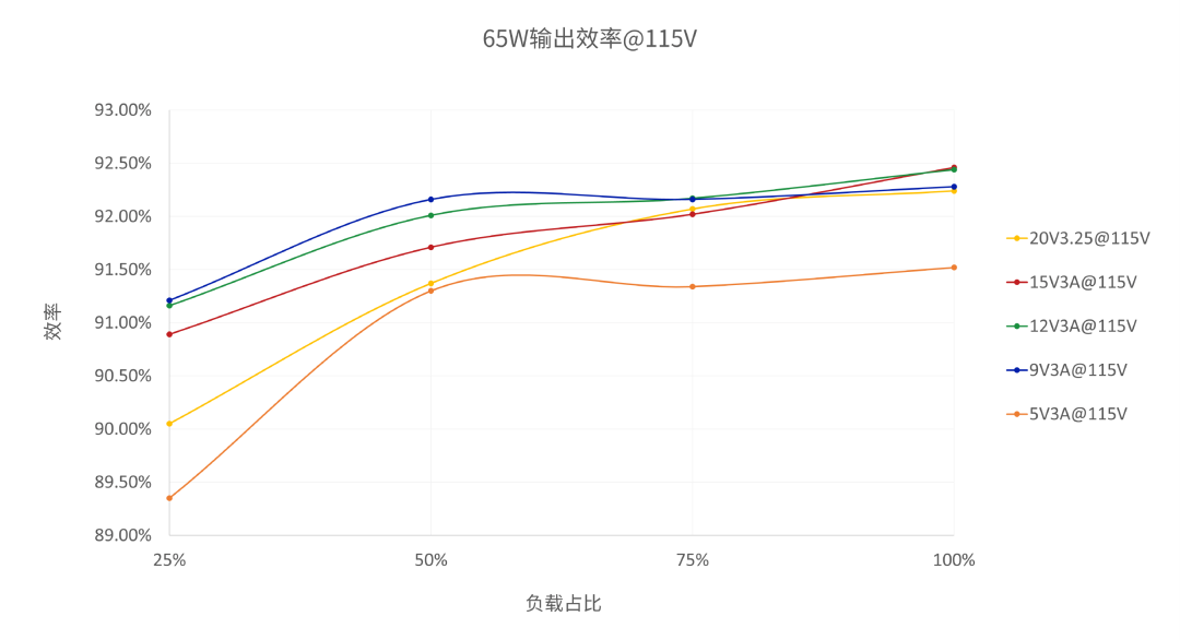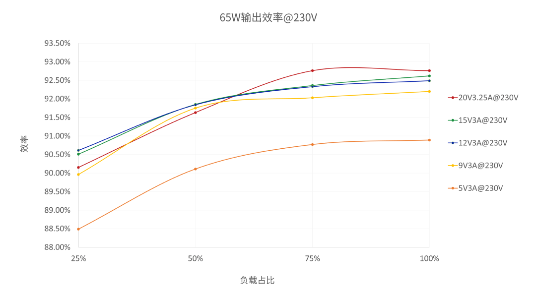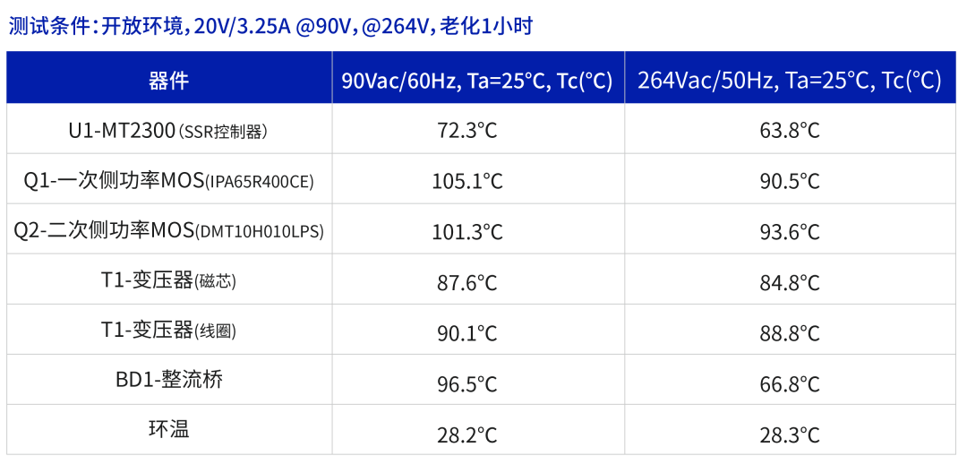 为保证产品的安全可靠性,设备长时间工作导致的发热情况也是用户的关注点。将方案在开放环境中,以20V/3.25A 65W的功率持续输出1小时,各关键器件的温度均保持在较好的温度范围内,符合安规要求,可靠性高。