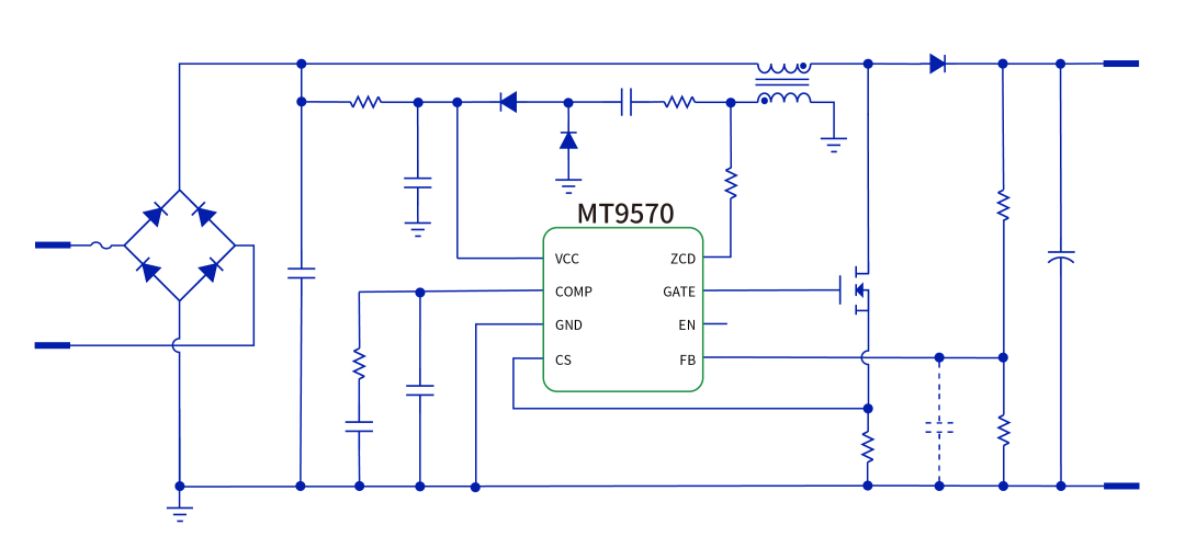 MT9570集成EN待机功能实现超低待机功耗,实现静态电流13uA,采用增强型EA,在启动和动态负载期间还具备更小的过冲/下冲,集成误差放大器易于环路设计,为广大客户工程师朋友提供性能可靠的PFC电源国产替代解决方案,可广泛应用于USB-PD充电器、AC-DC适配器、LED驱动器、工业电源、电动工具等领域。