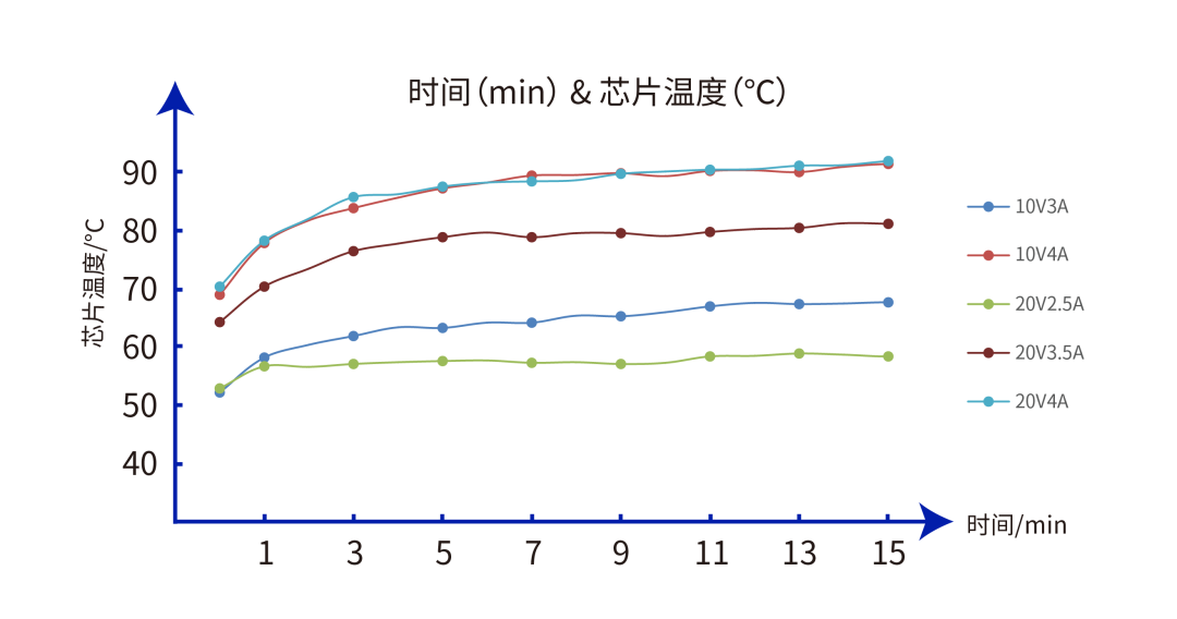 在80W大功率充电时,由于芯片转换效率高,功耗小,从而达到较低的温升特性,能够保证芯片长时间持续的大功率充电,同时,较低的温升特性也便于手机等应用的散热设计。