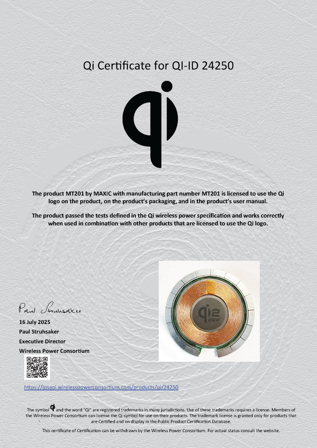 Maxic's independently developed wireless charging transmitter module MT201, with 25W output power, has obtained the latest Qi2.2.1 certification (Qi ID: 24250). With Maxic’s wireless charging transmitter MT5820, which can charge multiple devices simultaneously, the module supports BPP (5W), EPP (15W), and MPP (25W).