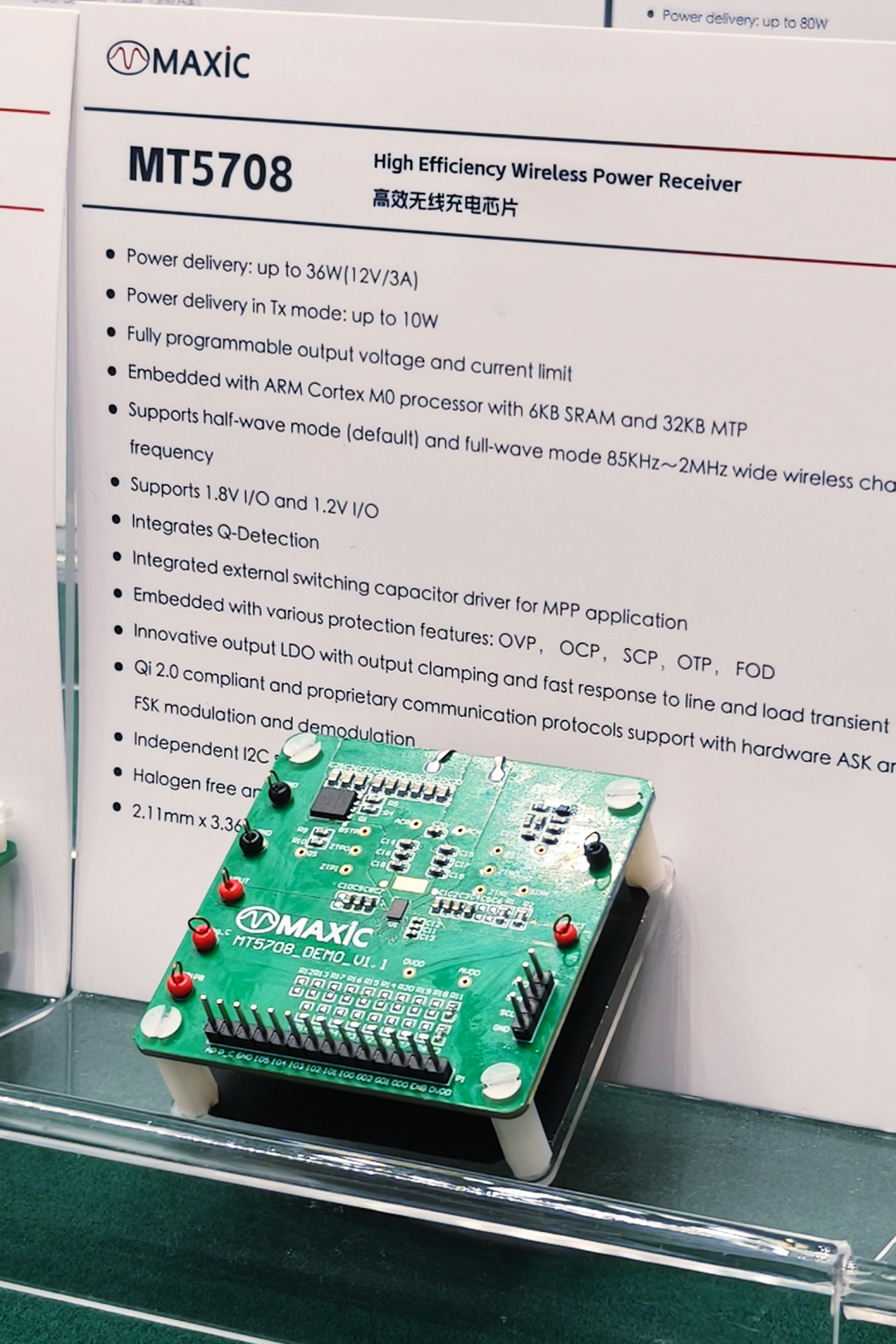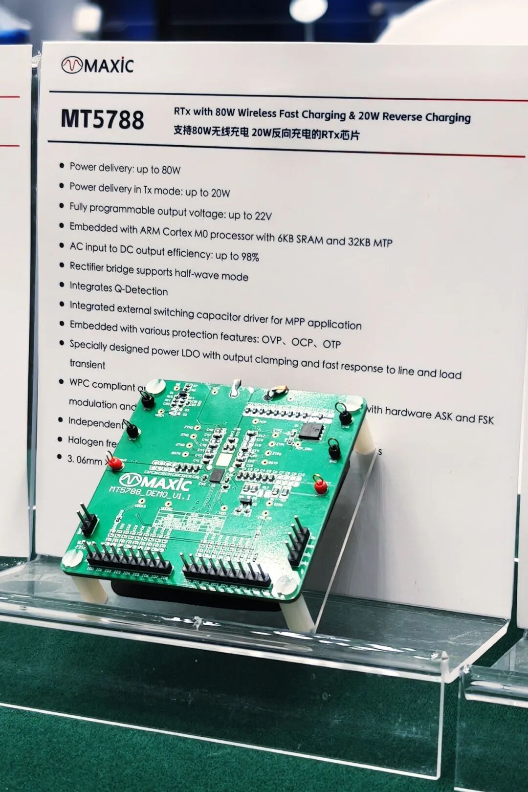 在无线充电接收端,重点展示了高度集成、高功率密度的36W无线充电RTX 芯片MT5708和高集成高效率支持BPP/EPP/MPP的100W无线充电RTX芯片MT5788。