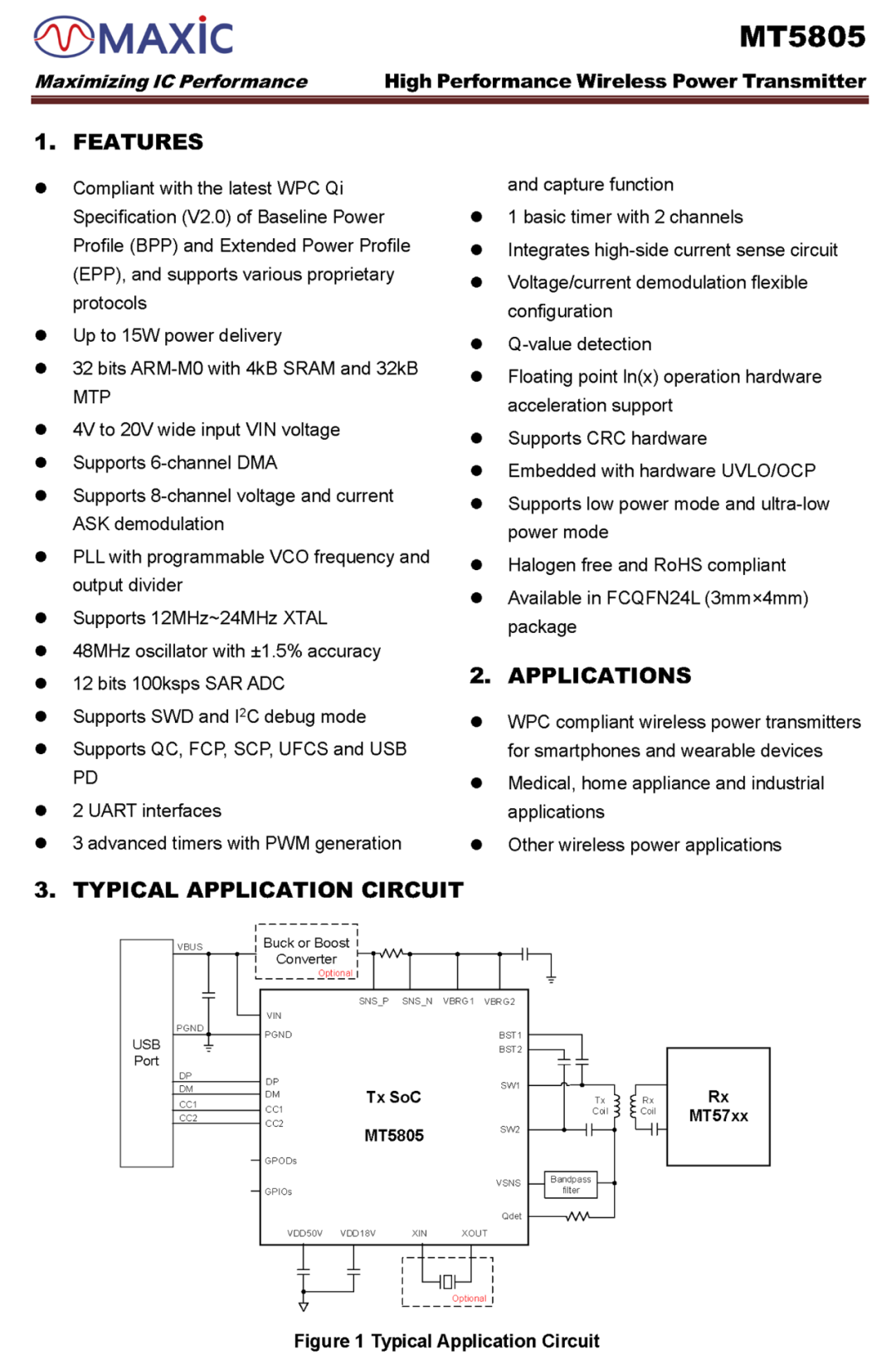 MT5805支持过压保护、过流保护、欠压保护和过热保护,还内置了动态功率限制,支持动态降功率输出。芯片采用FCQFN3*4-24L封装,适用于手机及可穿戴设备的无线充电发射端,医疗设备,家用电器以及工业设备的无线充电应用。